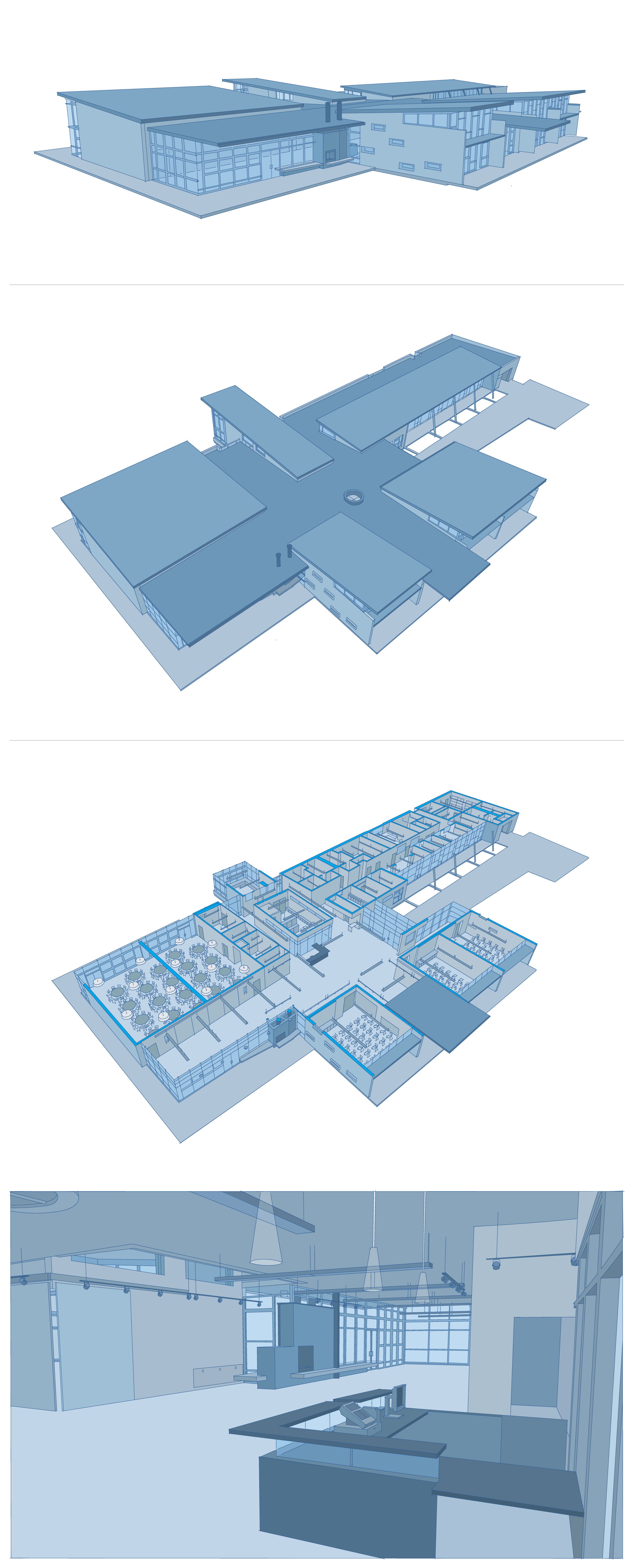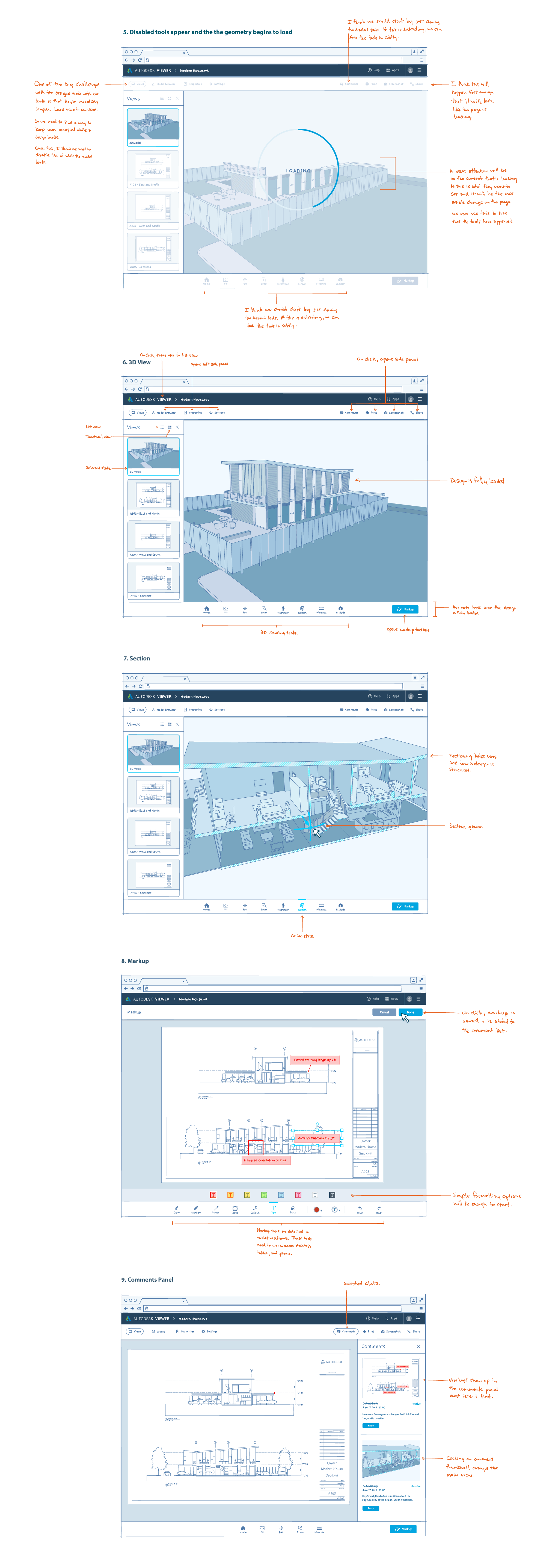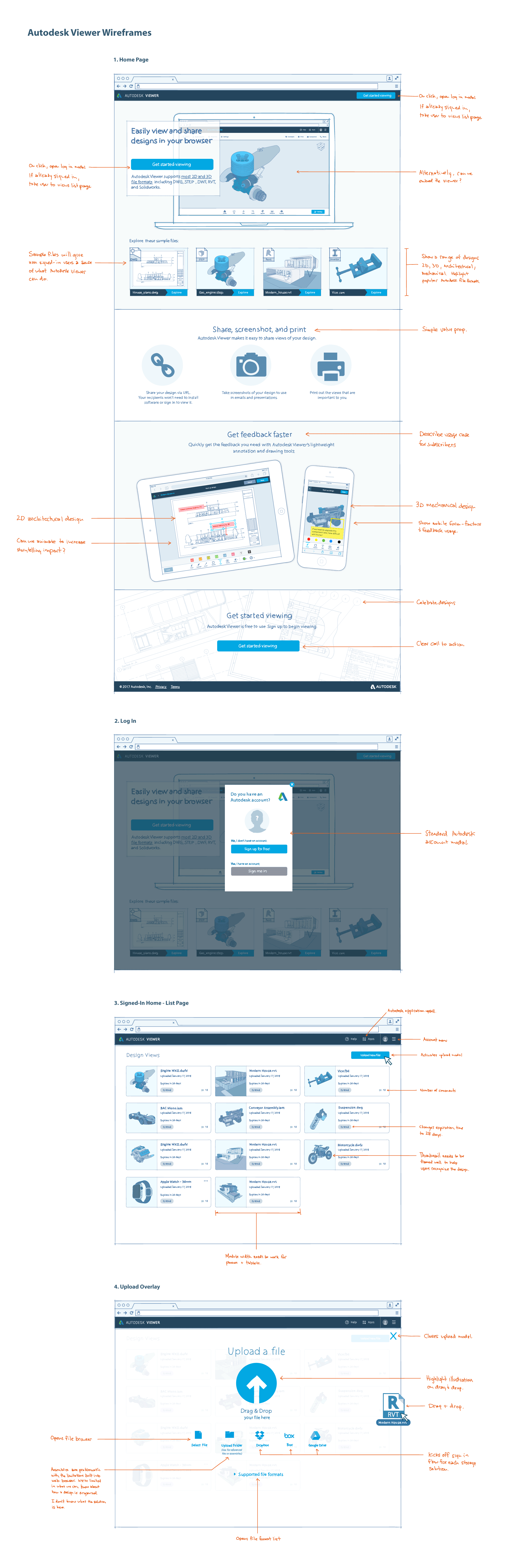[↓] Even at the wireframing stage, it's important to get a feel for what the final experience will be. Since Autodesk Viewer makes it possible to view and interact with architectural and mechanical designs, the wireframes needed to incorporate this kind of content. These were drawn with a Wacom Cintiq and Adobe Illustrator.