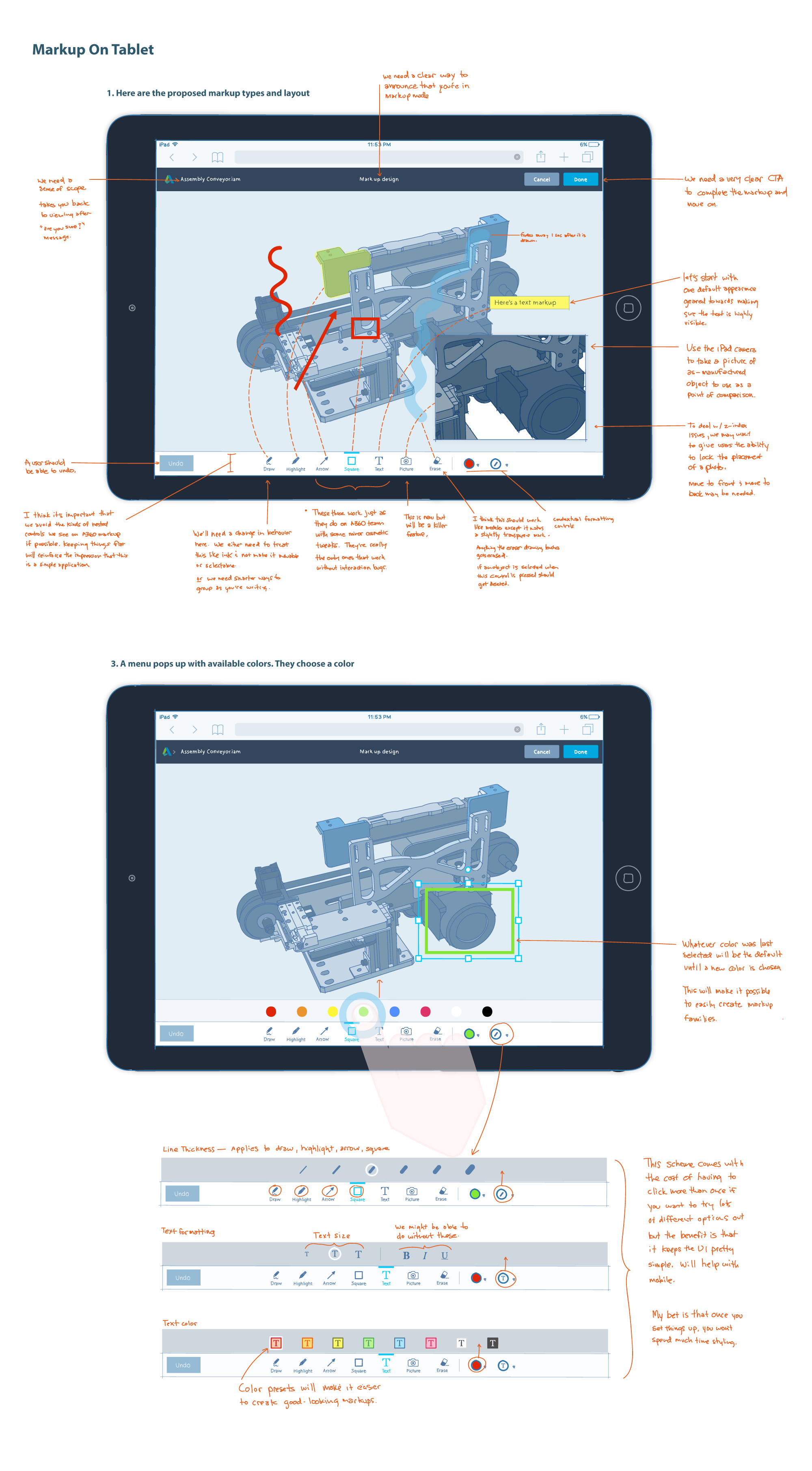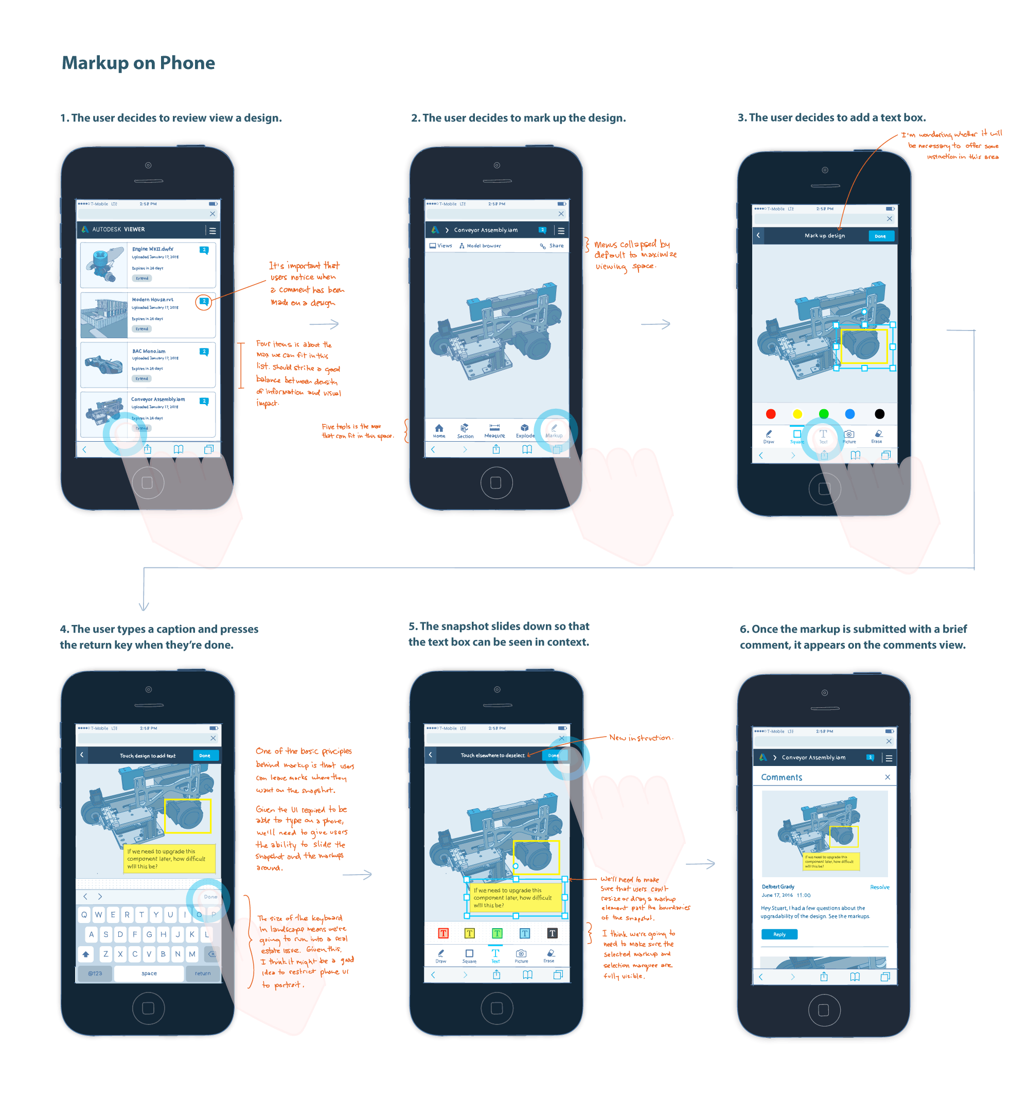 These wireframes describe how markup drawing works on smartphones. When I wireframe, I always try to imagine a user going through the interaction. This helps me anticipate any issues or edge cases that may occur.
