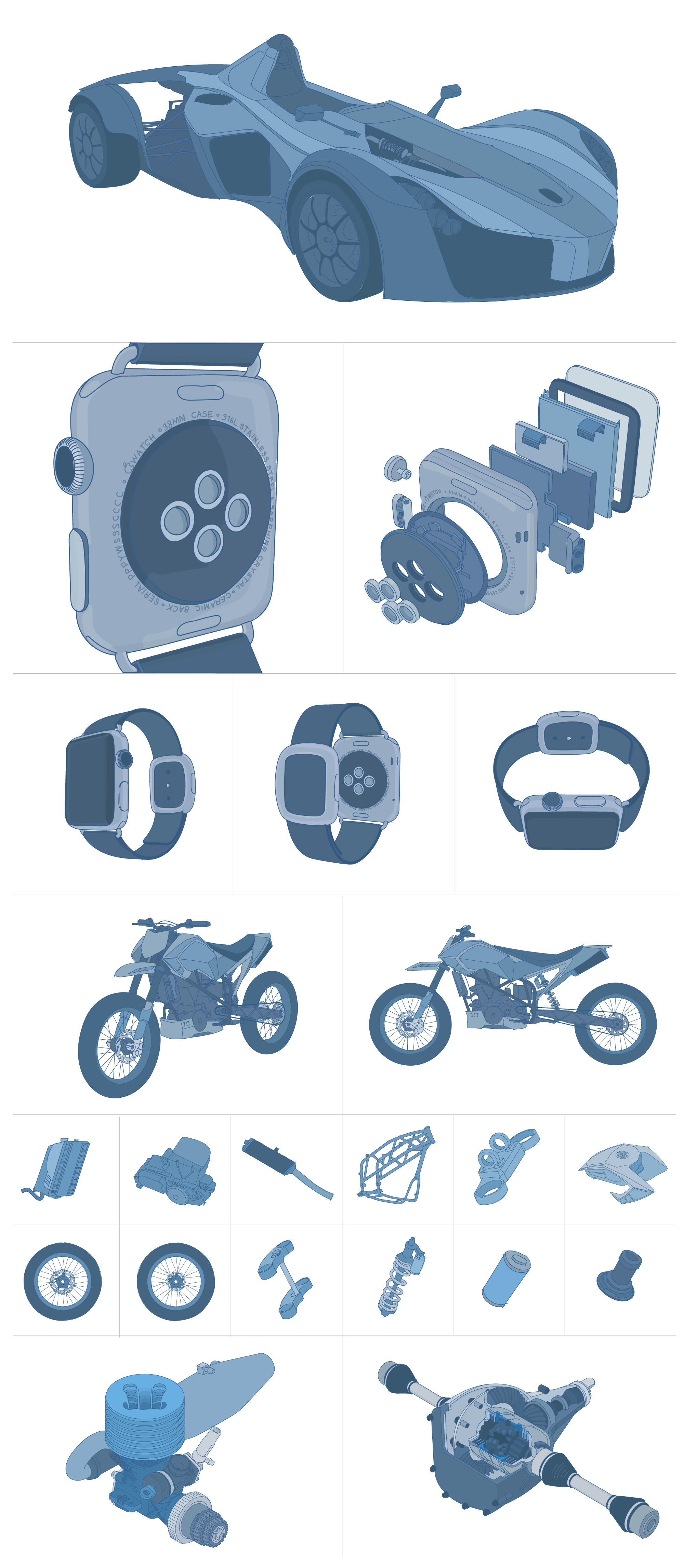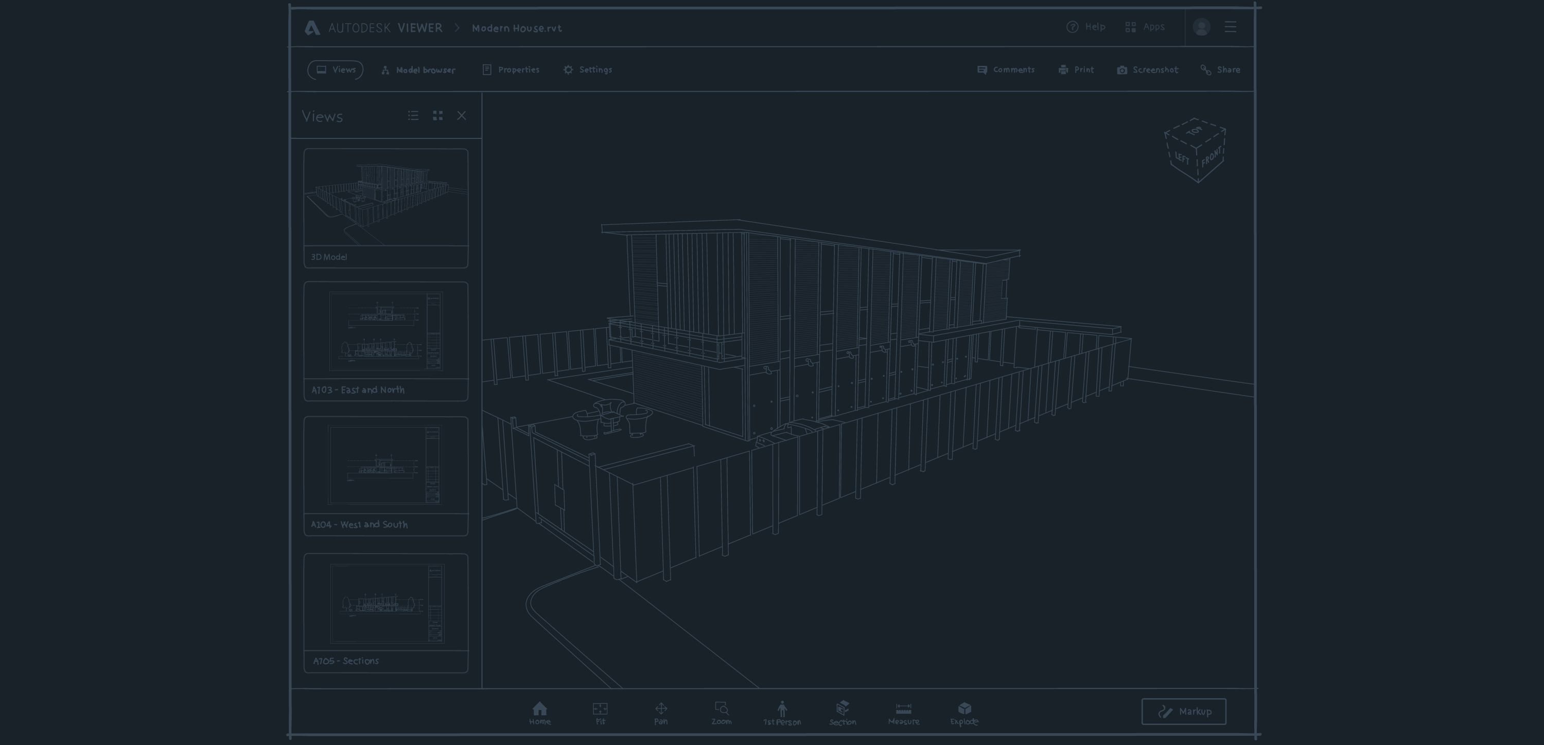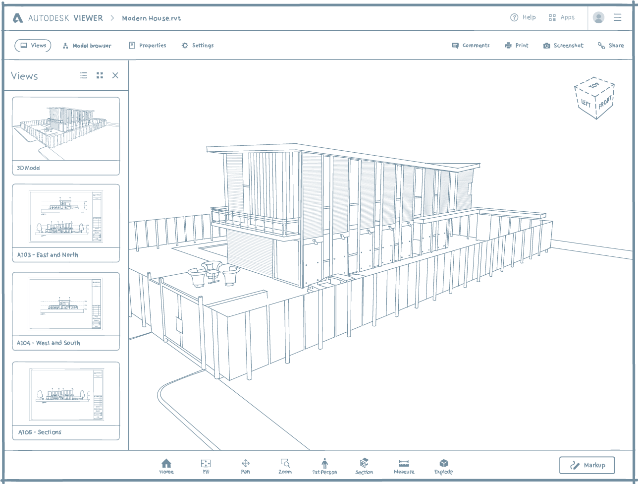 Even at the wireframing stage, it's important to get a feel for what the final experience will be. Since Autodesk Viewer makes it possible to view and interact with architectural and mechanical designs, the wireframes needed to incorporate this kind of content. These were drawn with a Wacom Cintiq and Adobe Illustrator.