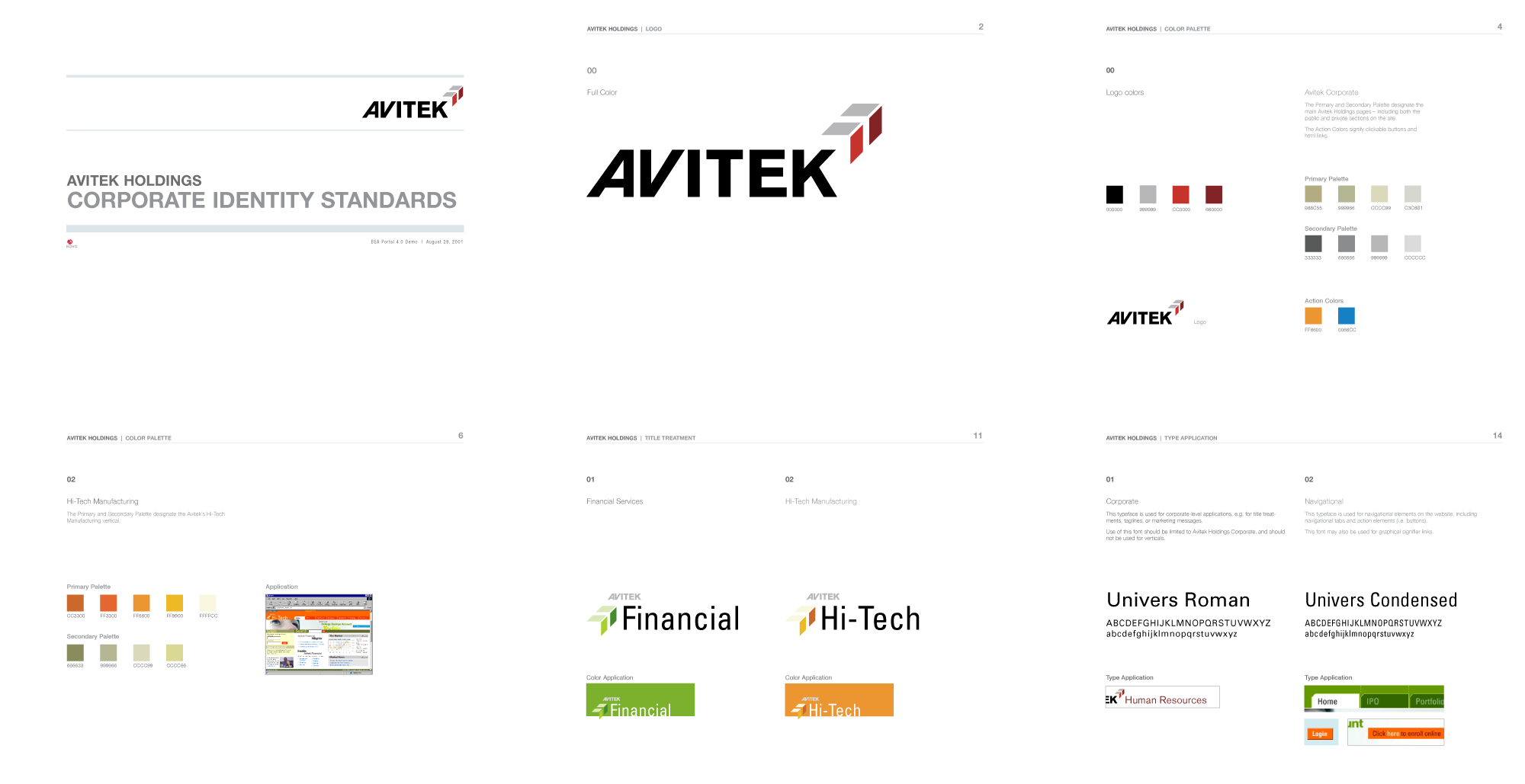 It was important that the demos felt like they were from a real company. We developed an identity for a fictitious multinational holding company named Avitek. Each Avitek subsidiary was given a distinct color scheme to ensure that the demo audience would understand when presenters moved from one product to another.