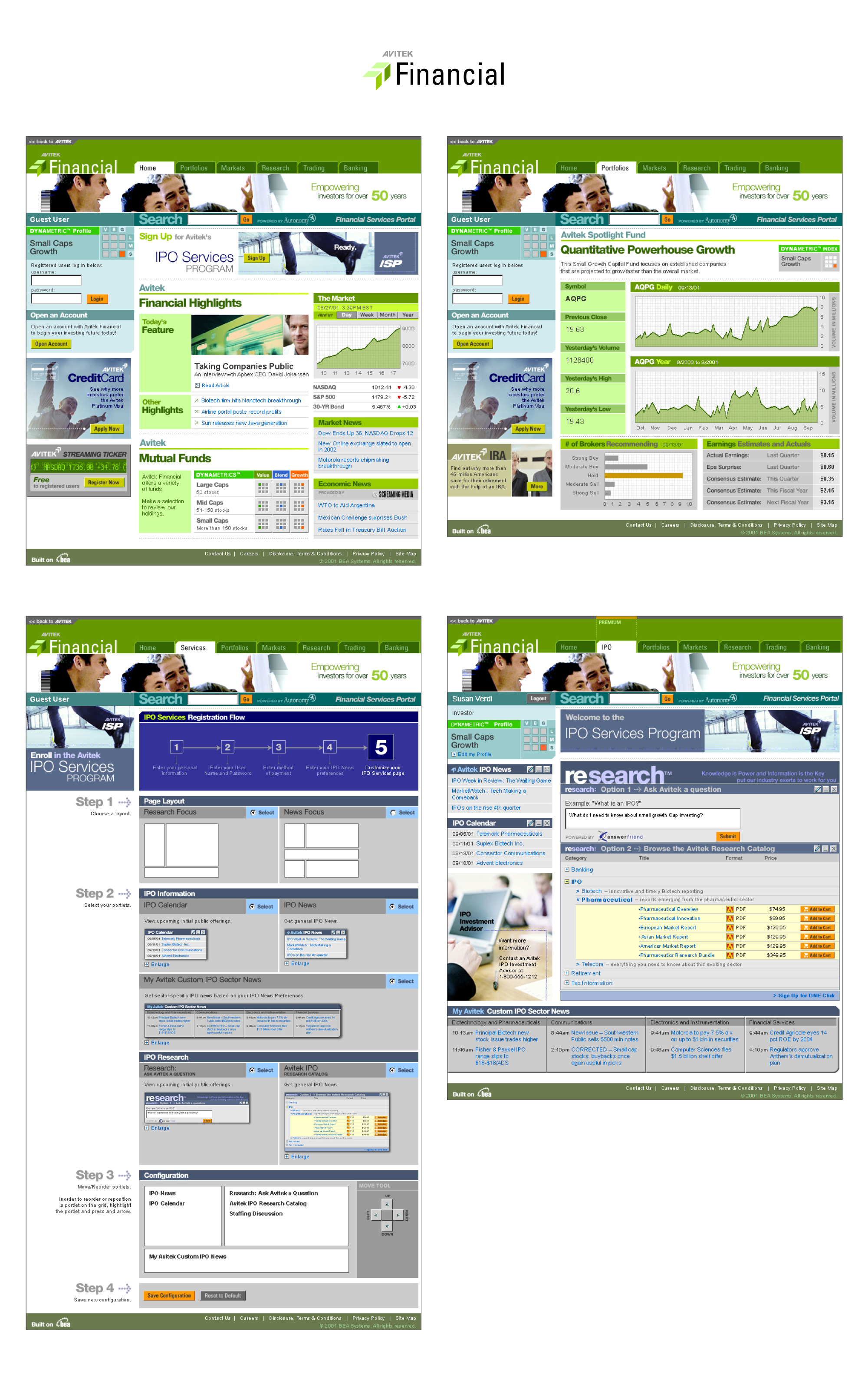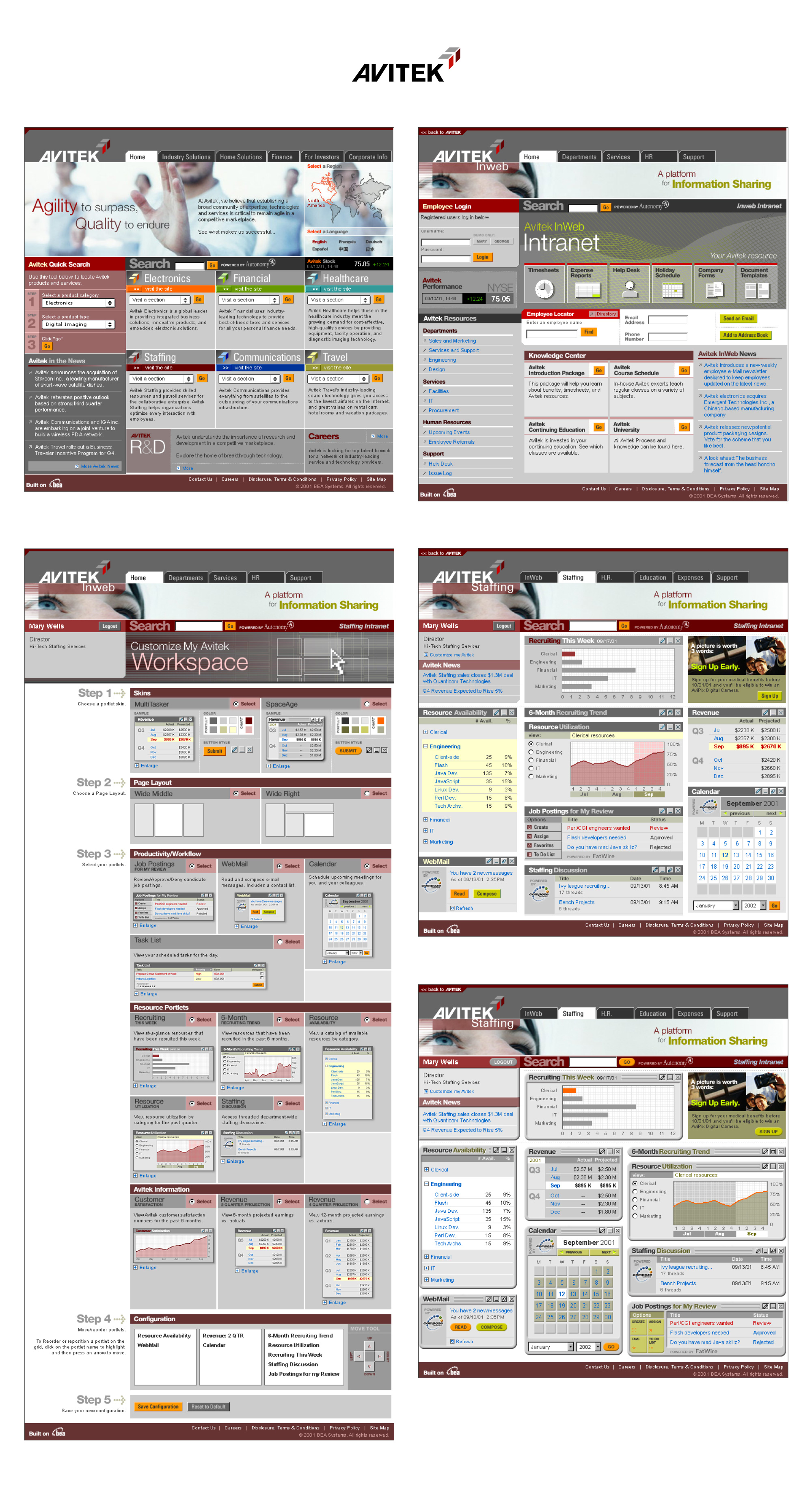 [↓] Avitek intranet was created to show how BEA's portal technology could be used to easily compose dashboard pages for company employees. Each demo featured 10-12 pages, and each page had enough interactivity to create the impression that the presenter was interacting with a live website.