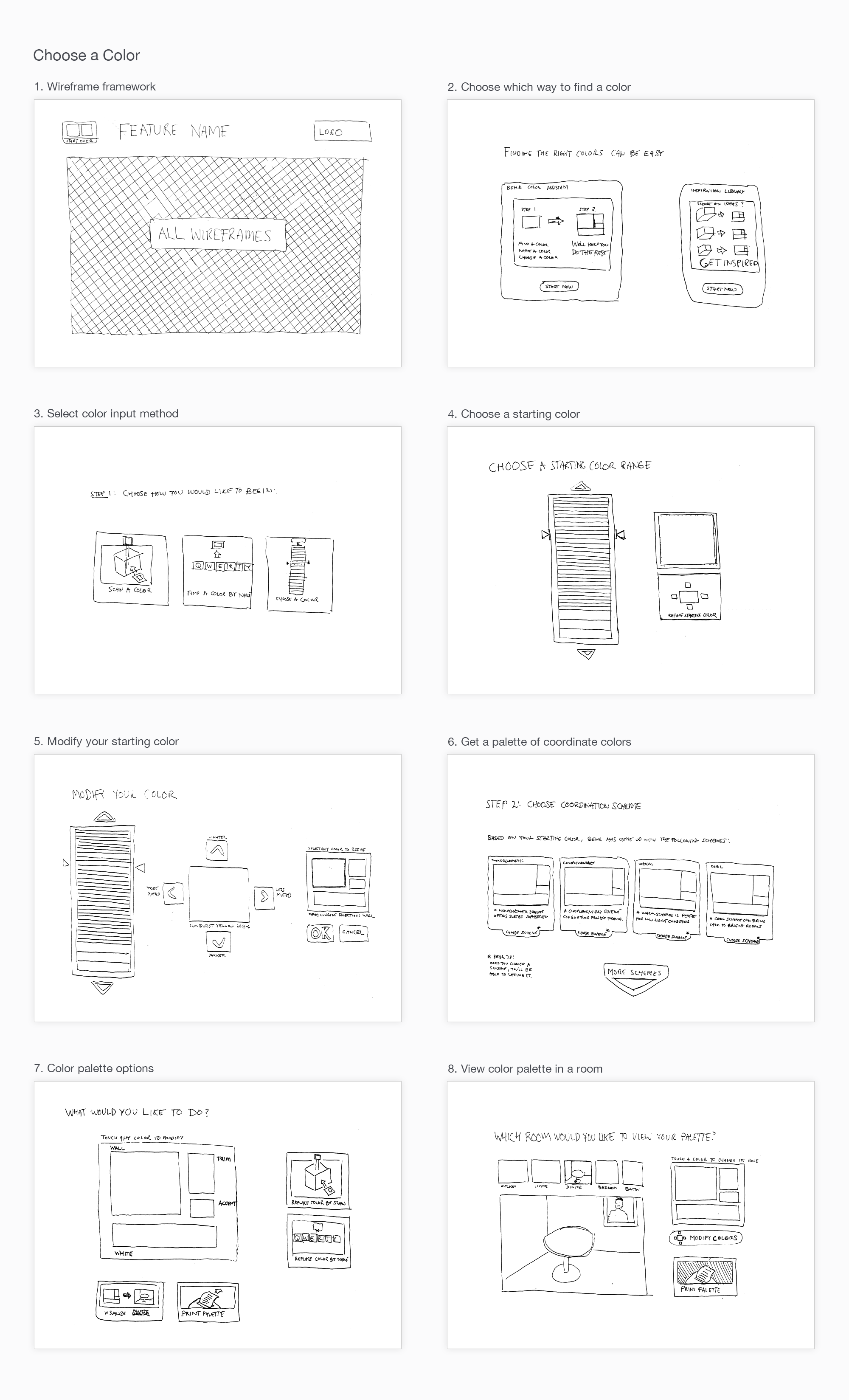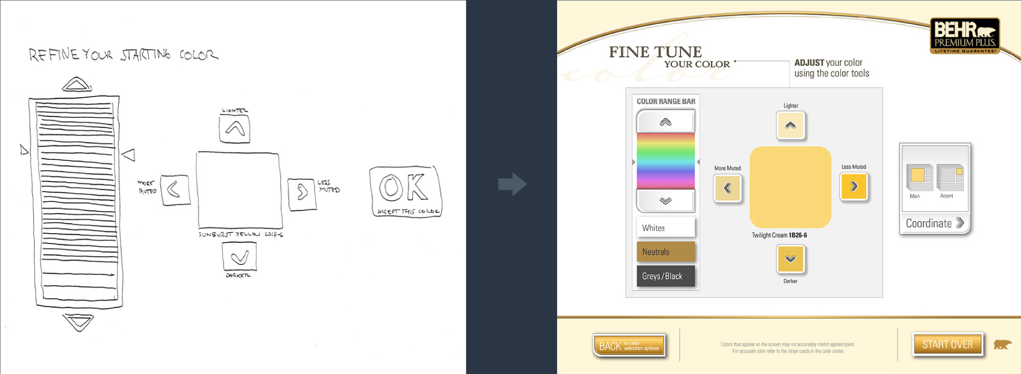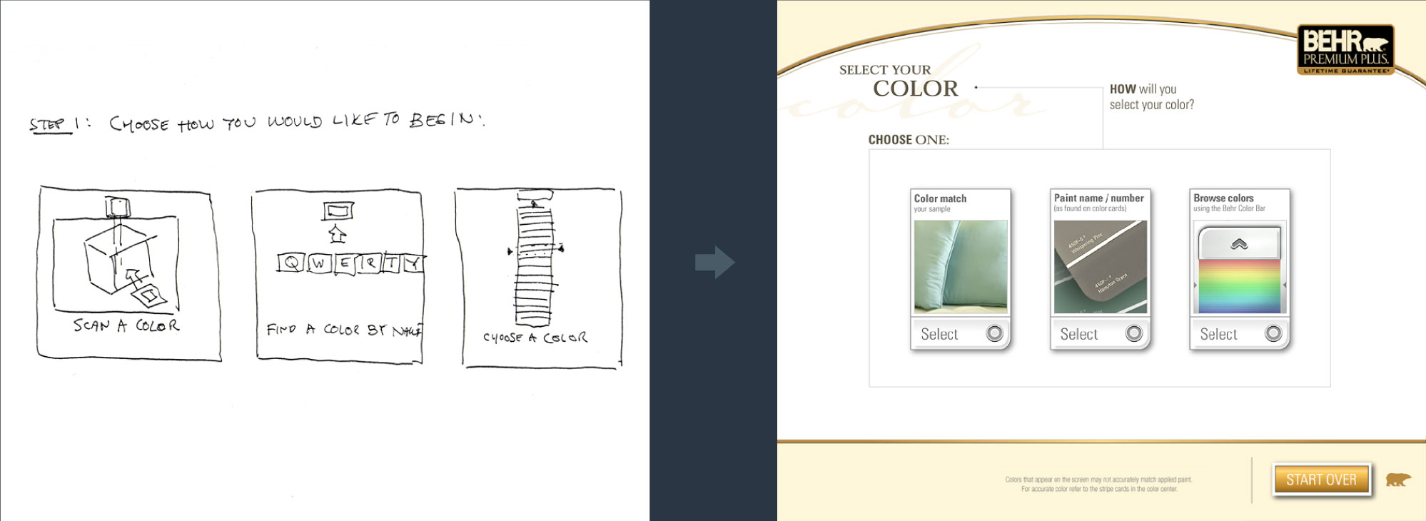 Interface ideas were sketched on paper at full-size. They were taped to a wall so that we could get a better sense about what the kiosk would feel like. This helped us uncover usability issues before moving to visual design. The basic organizing idea behind the kiosk was one task per screen with new choices being progressively disclosed. Animations would provide continuity as the user moved through the color selection process.