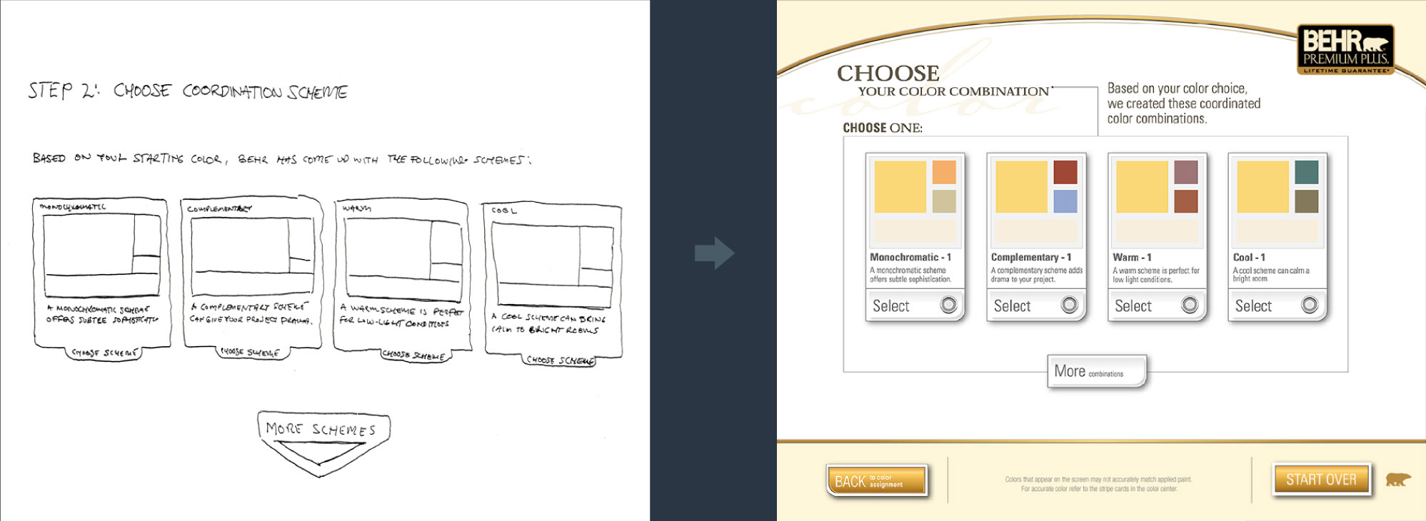 [↓] Here's the finished product in the Behr color center at Home Depot. The user's color choices would be incorporated into calls to action. At the end of the process, the user would receive a printout of their color choices and had the option of saving their choices for viewing and exploration at home.