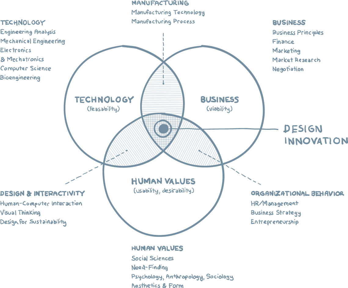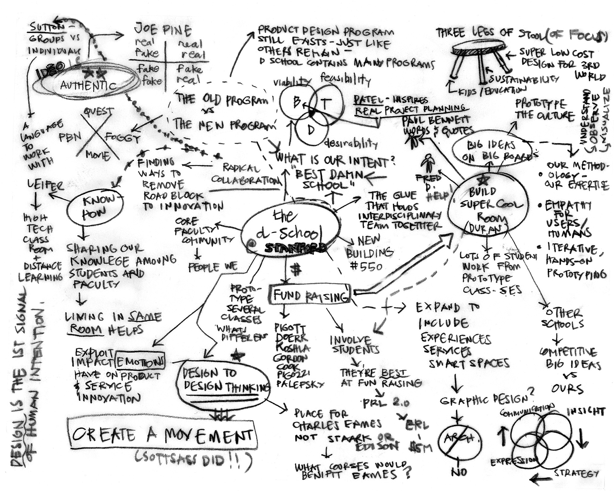 [↓] David Kelley created this mindmap to describe the scope and approach of the new design school. This became the background image for the site and inspired the use of hand-lettered text in the design of the site.
