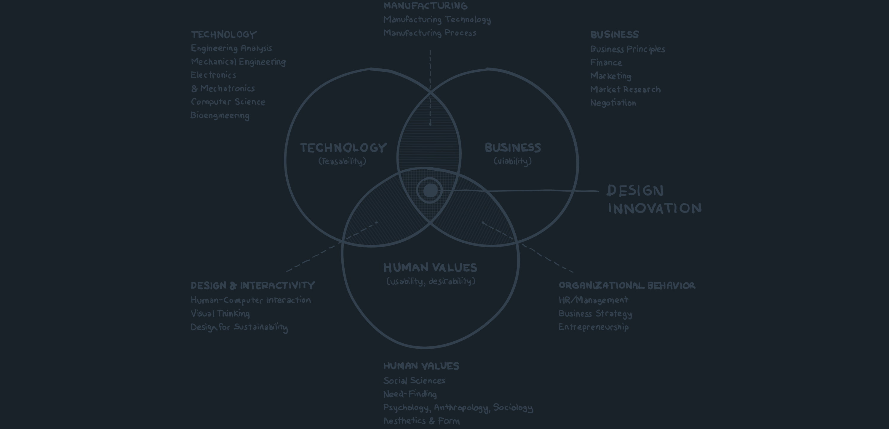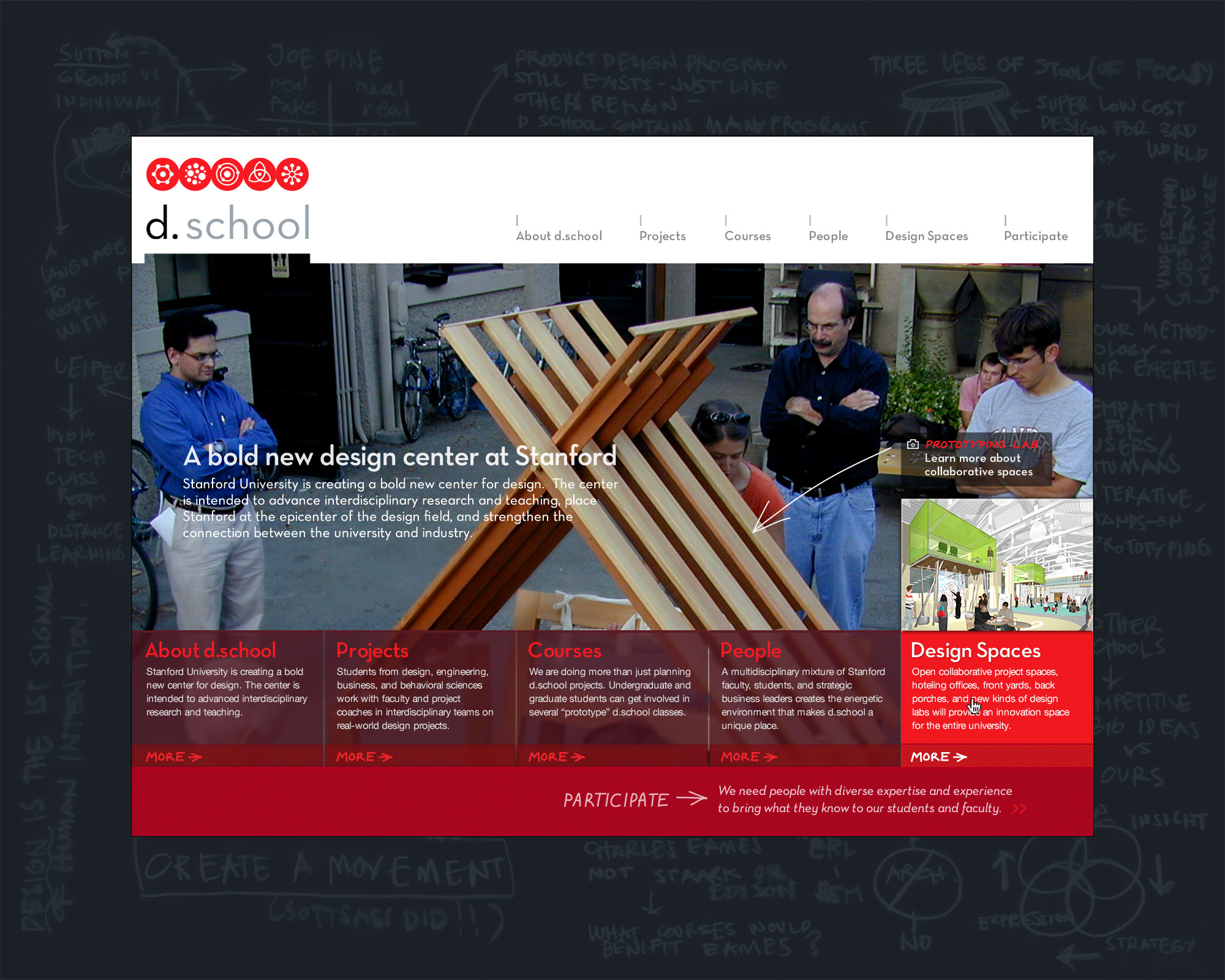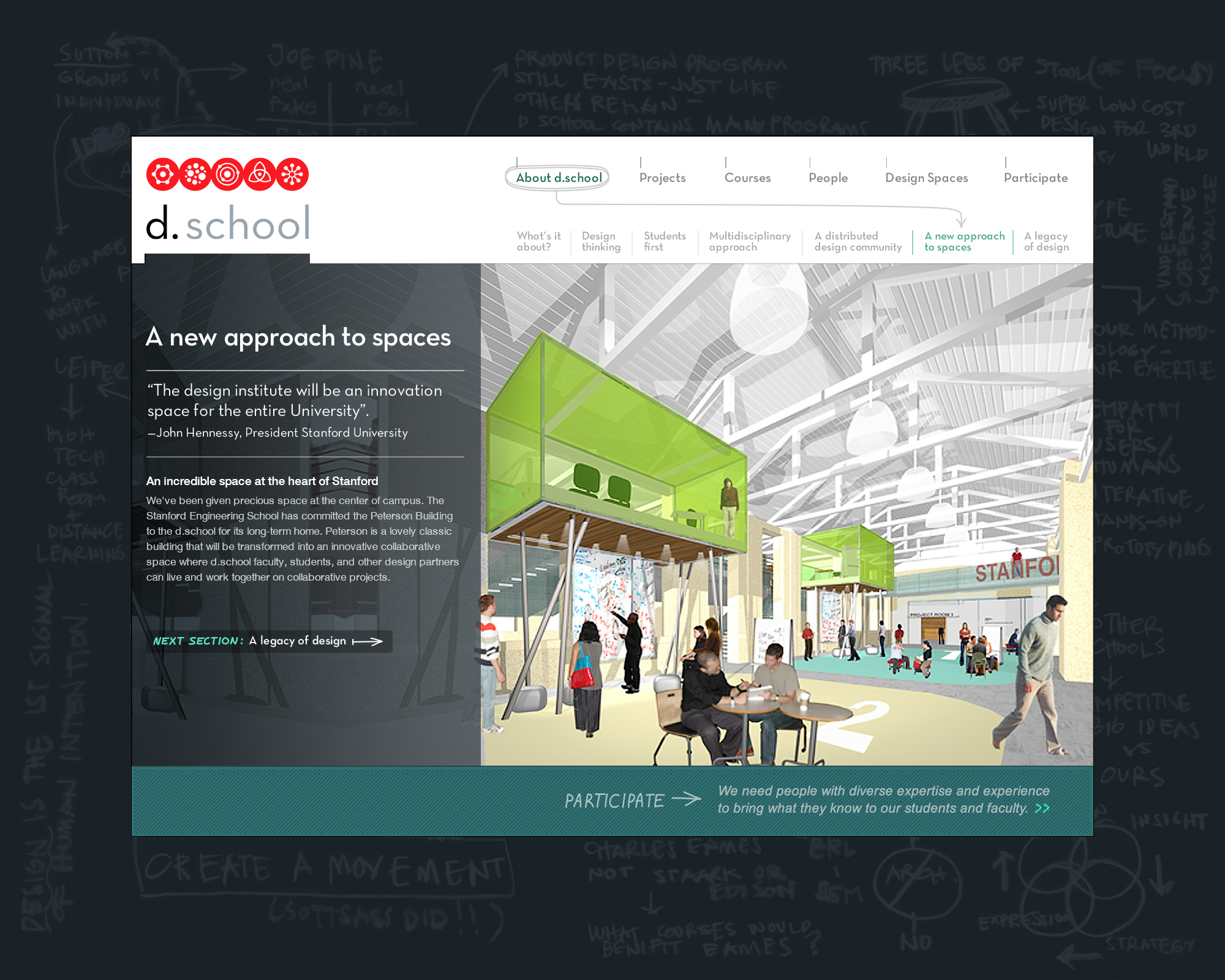 David Kelley created this mindmap to describe the scope and approach of the new design school. This became the background image for the site and inspired the use of hand-lettered text in the design of the site.