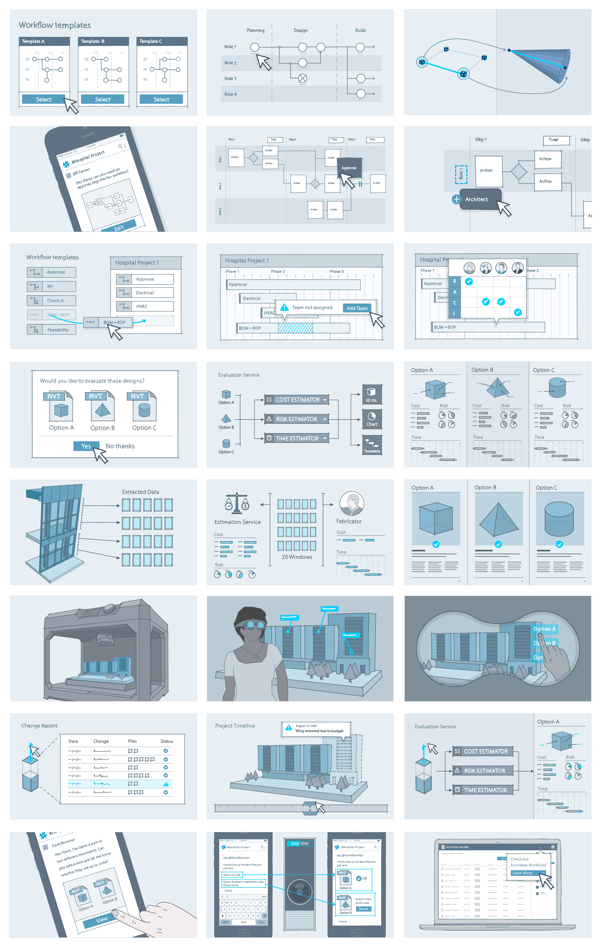 [↓] These illustrations and icons were designed to describe the product architecture for a CAD visualization platform.